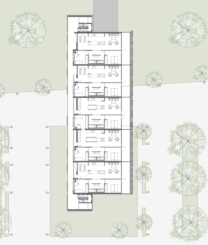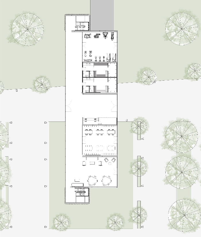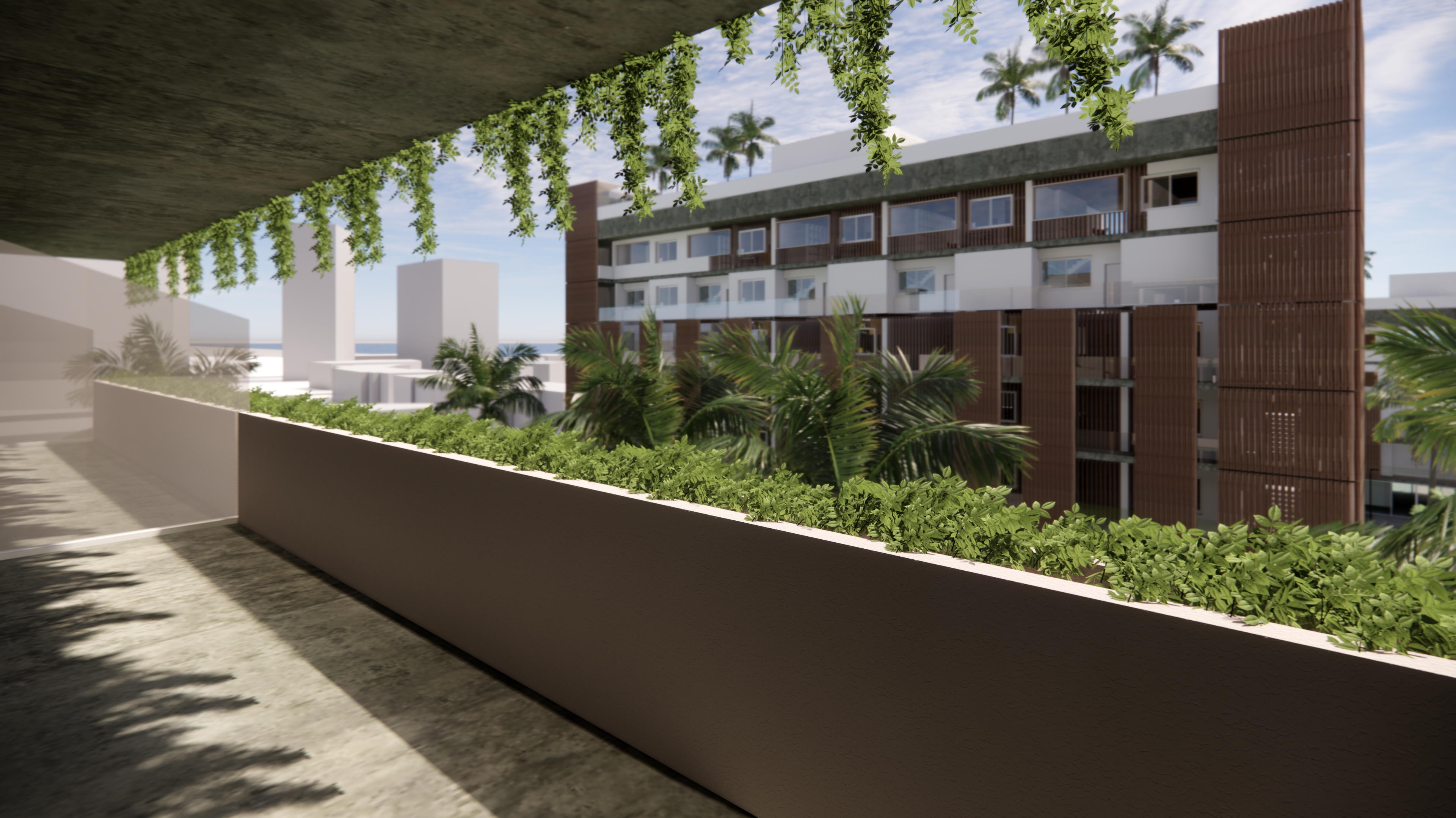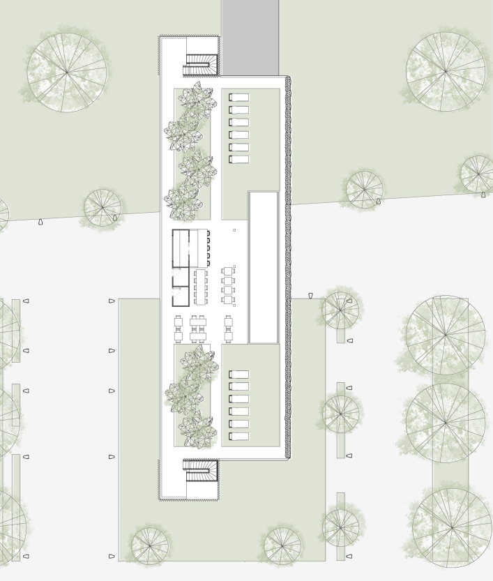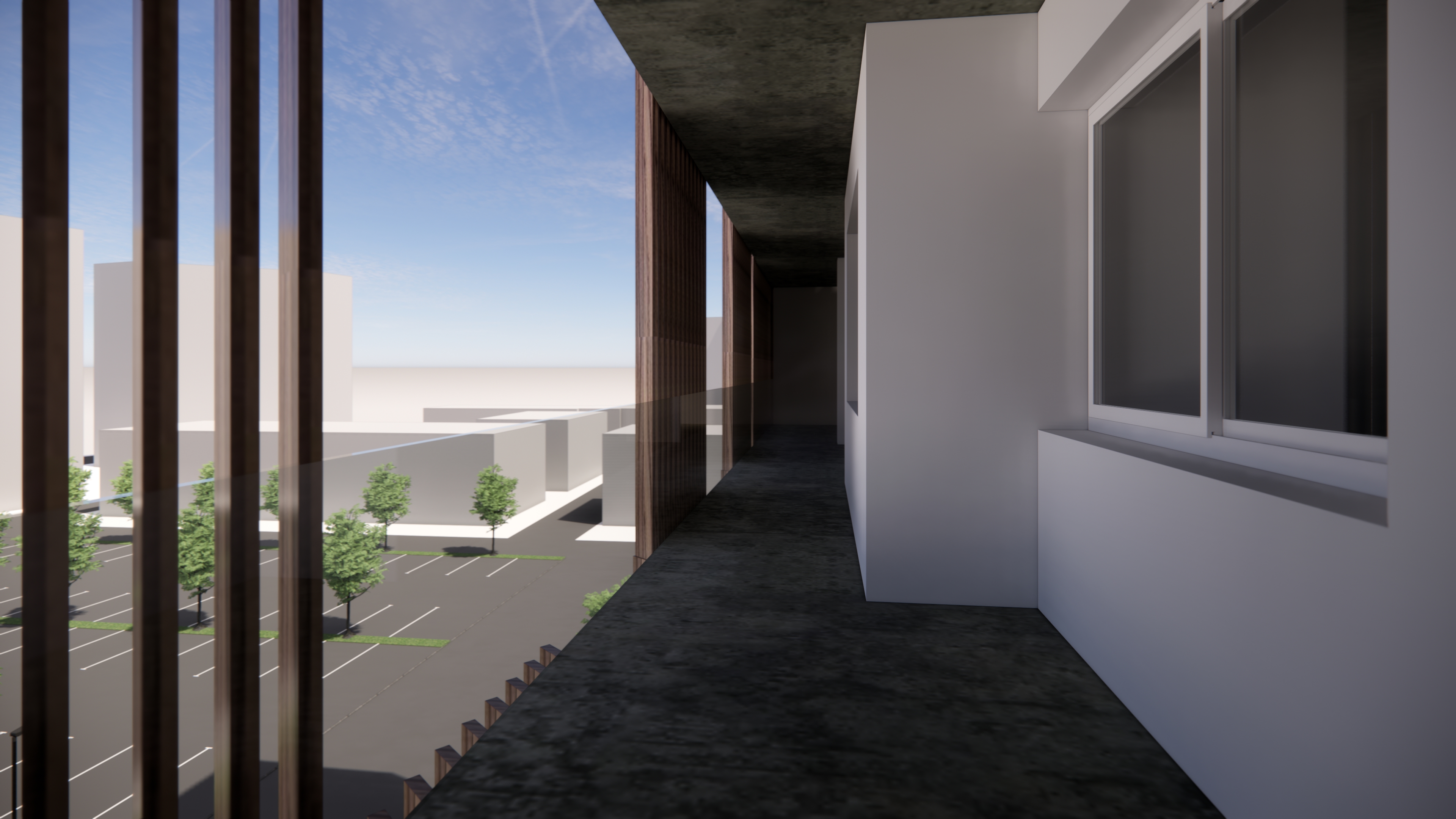 Para mantener un nexo en común con los otros proyectos, se siguen planteando elementos horizontales con hormigón blanco y con lamas de madera. Pero lo que destacamos de este a los demás es el bosque vertical que creamos en la fachada este.