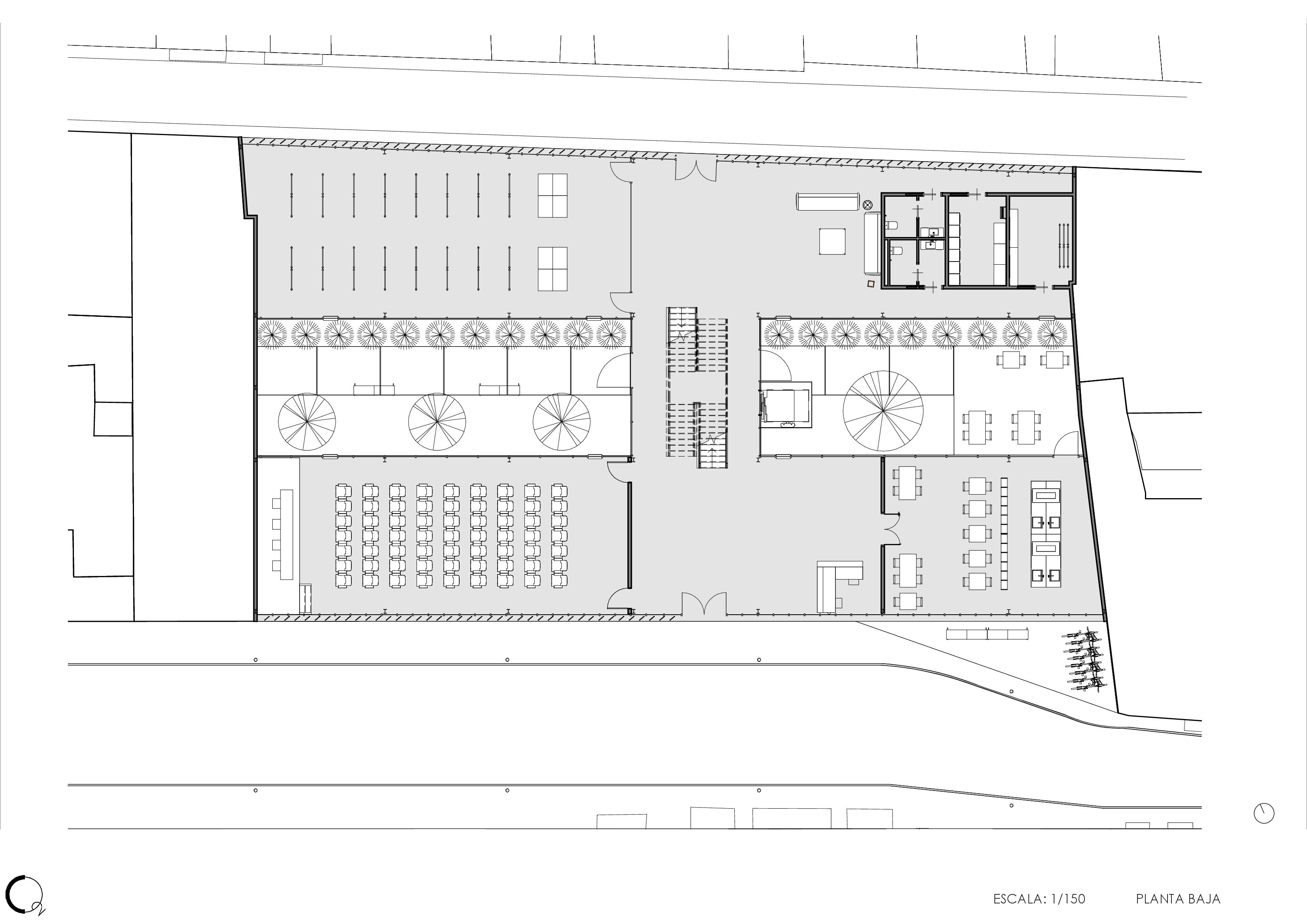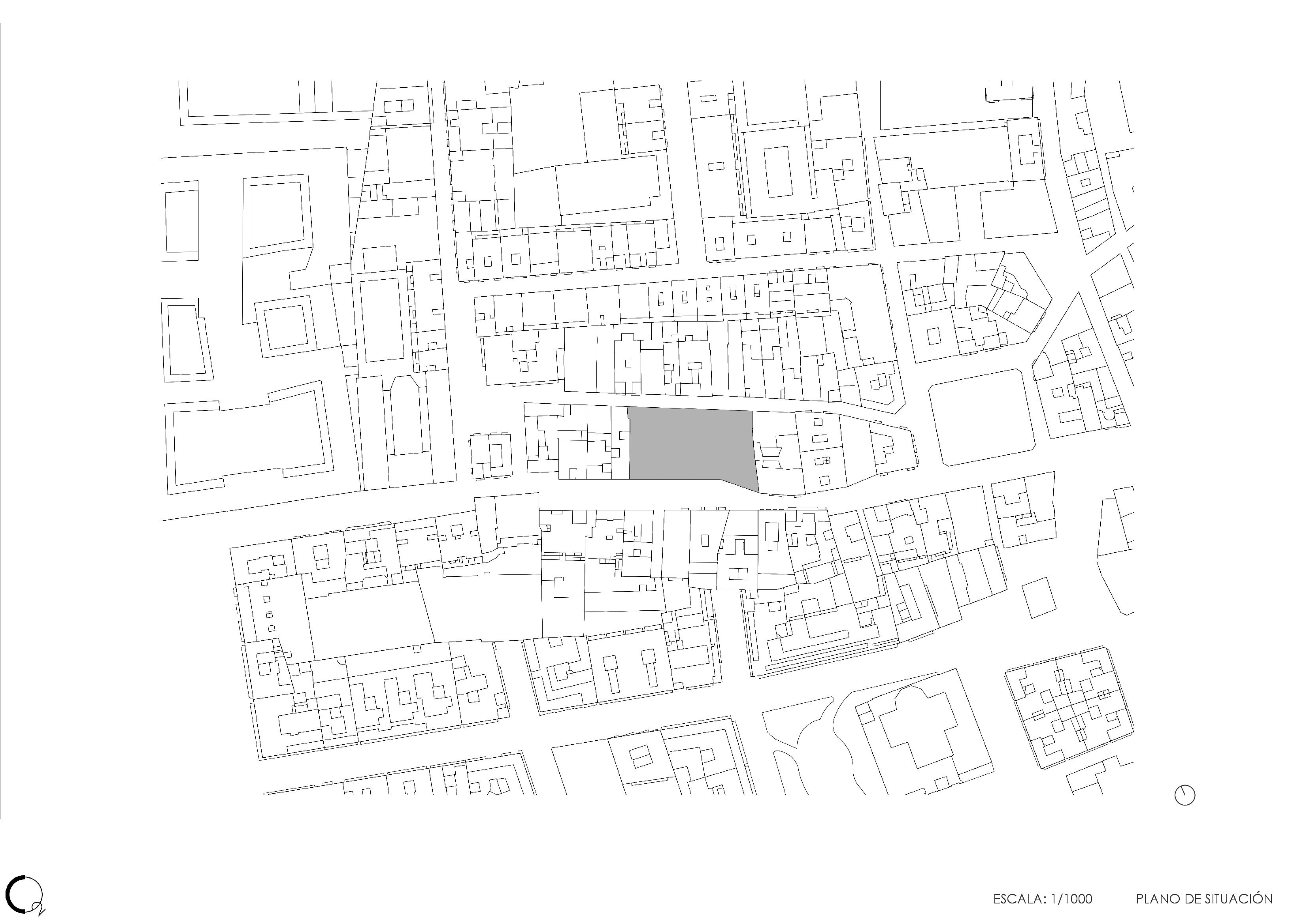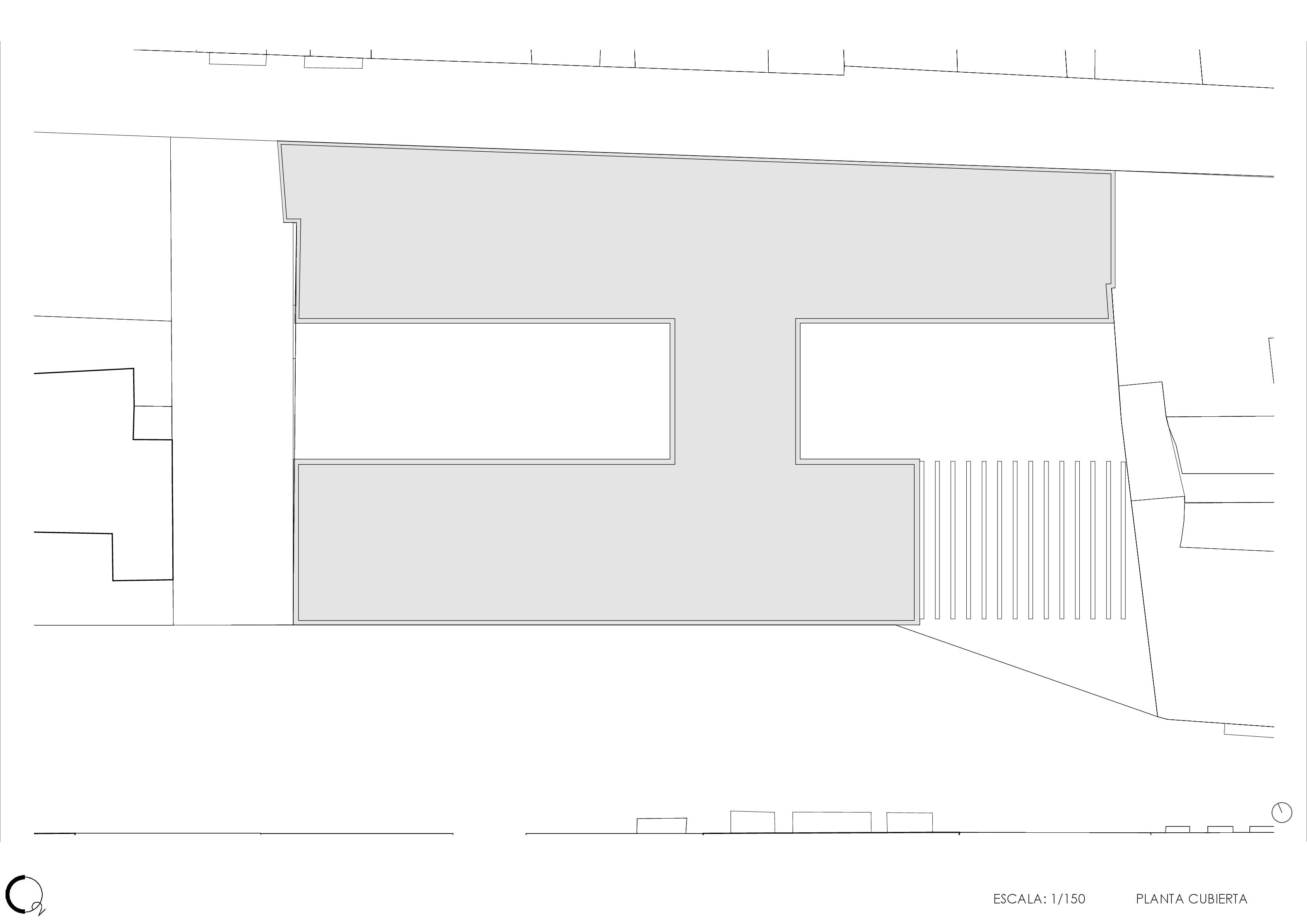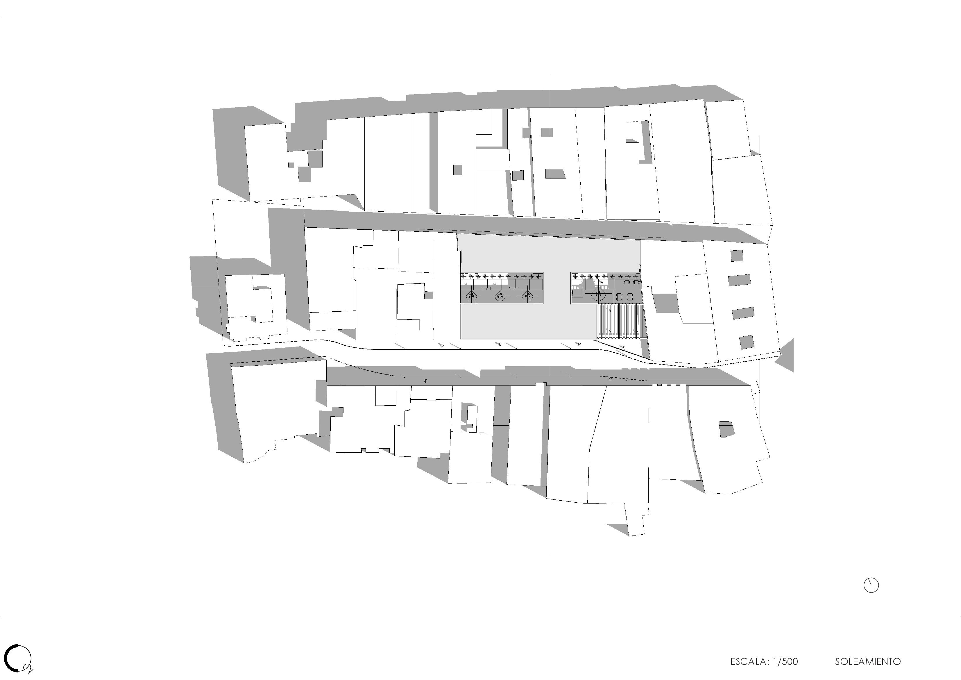 En según, planteamos el esquema final con el que resolveremos el programa del edificio. En la planta podemos observar los ejes principales que se juntan en el núcleo de la parcela.
